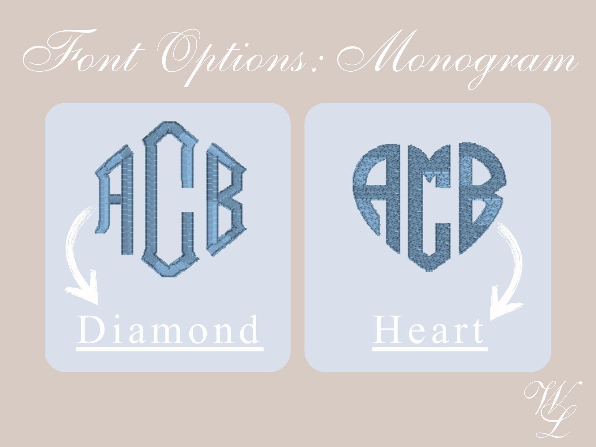 ~ Select single initial (serif or fishtail font), OR three-letter monogram (diamond or heart font)